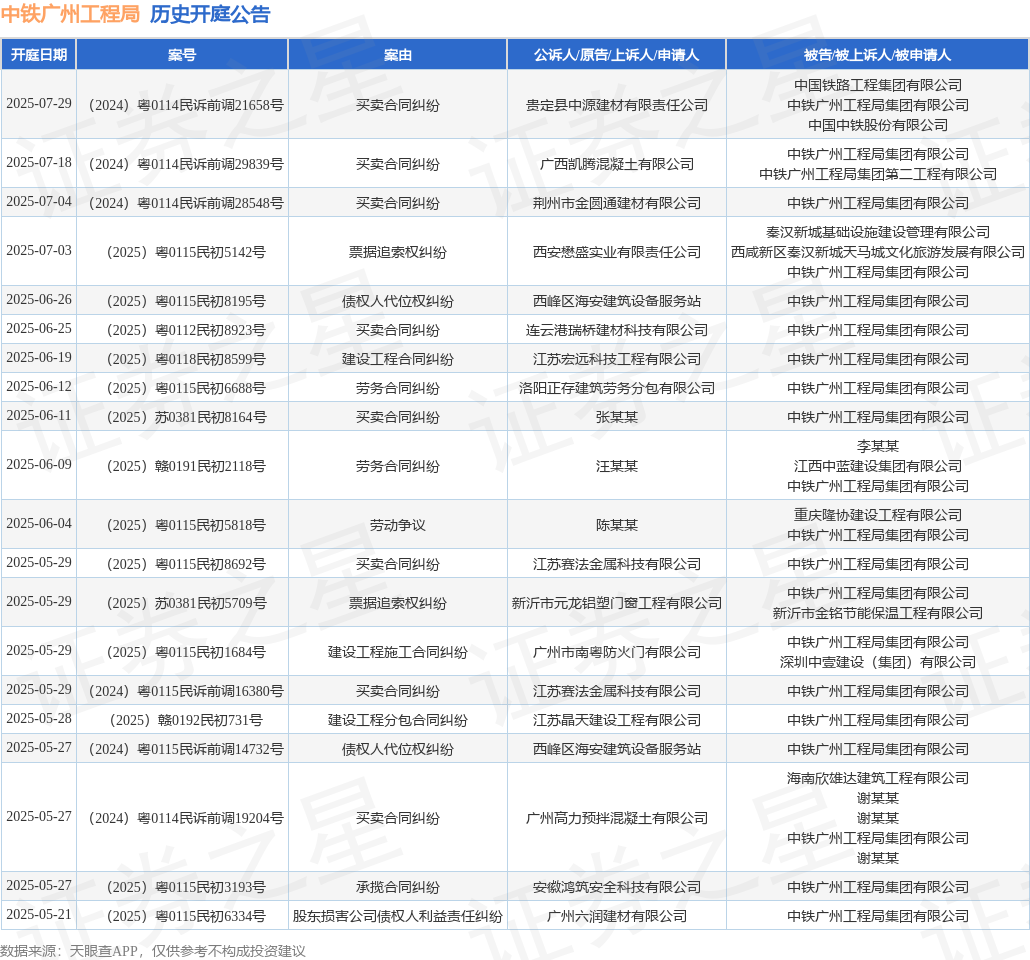 案号:(2025)辽0112民初3743号审理法院:沈阳市浑南区人民法院案由:建设工程分包合同纠纷当事人信息: 原告/上诉人:中铁广州工程局集团有限公司 被告/被上诉人:沈阳天北建筑安装工程公司开庭日期:2025年5月14日根据统计,近一年内以中铁广州工程局集团有限公司为当事人的历史开庭公告有349则,其中案由为“买卖合同纠纷”的公告以114则居首,其次为“建设工程施工合同纠纷”有36则,“建设工程分包合同纠纷”有28则。历史开庭公告(前20条)如下: